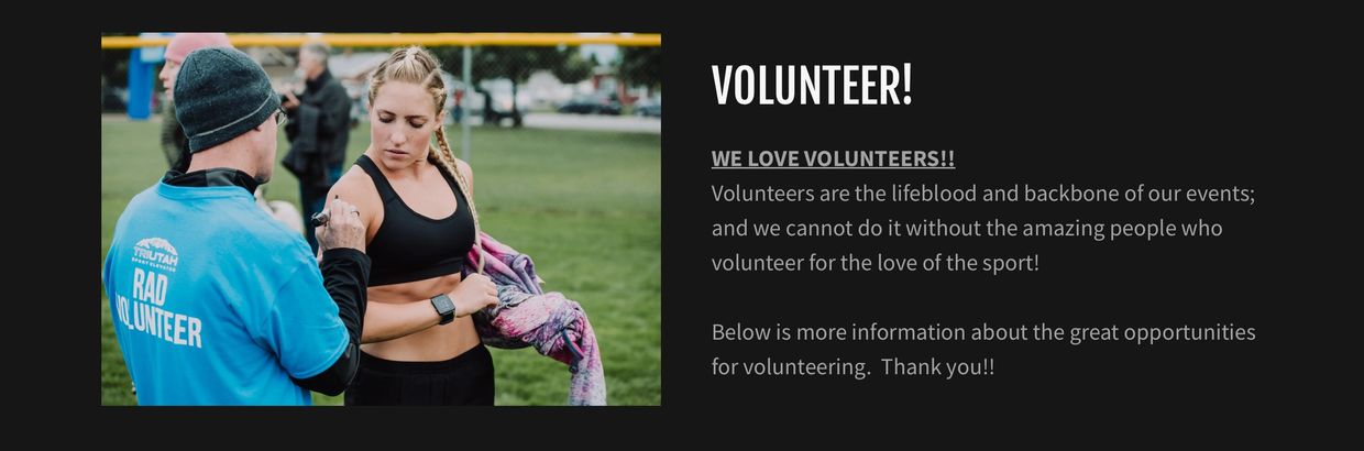 If you are an individual looking to volunteer, we'd love to have you! Our "trade for a race" program gives athletes the opportunity to volunteer in exchange for a future race entry. (5 hour minimum requirement)